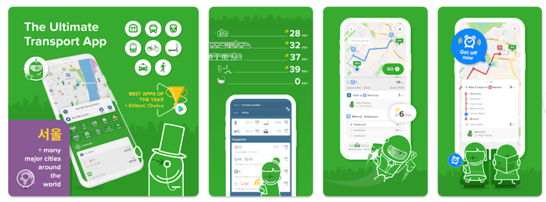 Citymapper는 세계 주요 대도시의 대중교통 정보를 실시간으로 제공하는 앱입니다. 버스, 지하철, 기차, 페리, 우버, 자전거 공유 등 모든 가능한 이동 수단을 고려한 최적의 경로를 제안합니다.