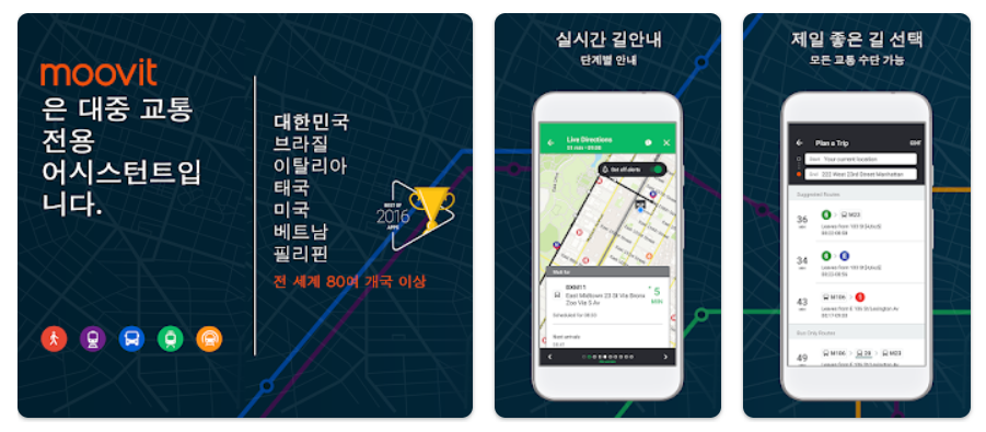 Moovit은 전 세계 3,400개 이상의 도시에서 실시간 대중교통 정보를 제공하는 강력한 앱입니다. 버스, 지하철, 기차 등 다양한 교통수단의 실시간 도착 정보와 최적의 경로를 안내해 줍니다.